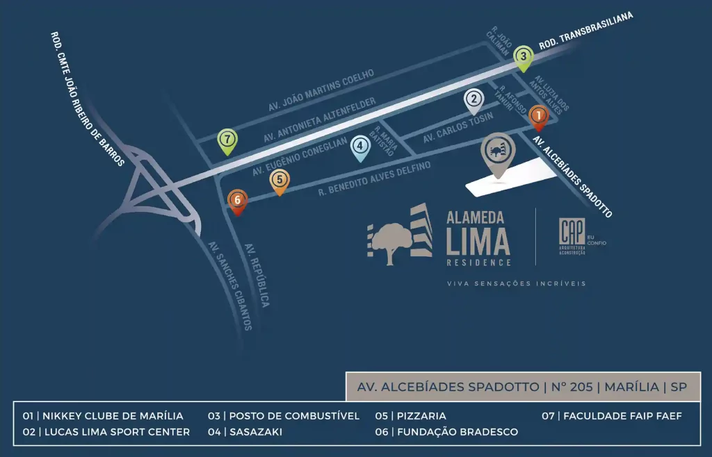 Condomínio Residencial Alameda Lima devidamente incorporado no R4 da Matrícula 66.111 do 2º Registro de Imóveis, títulos e documentose pessoas jurídicas de Marília-SP; Imagens meramente ilustrativas; Móveis, decoração, acabamentos e equipamentos não fazem parte do objetodo contrato e serão entregues conforme o memorial descritivo; O Empreendimento será construído na Avenida Alcebíades Spadotto, 205 na cidade de Marília-SP.